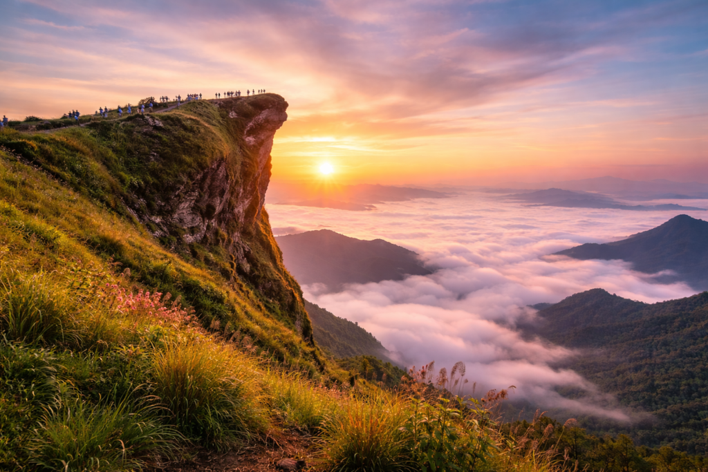 จุดเด่น ทะเลหมอก พระอาทิตย์ขึ้น สันหน้าผาชายแดน และวิวภูเขาซ้อนชั้น